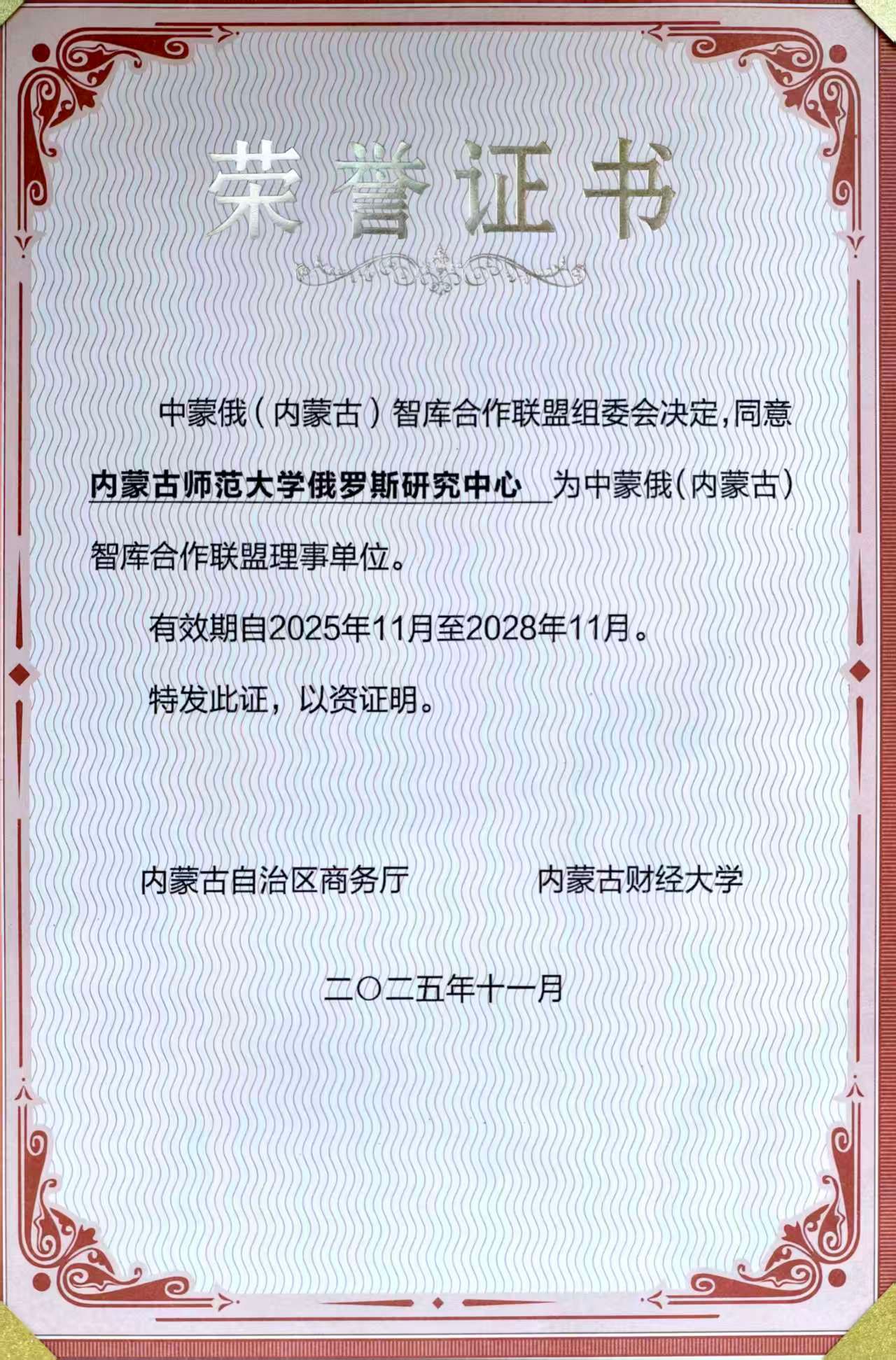 2025年11月12日,内蒙古财经大学科研处与中蒙俄经济走廊研究协同创新中心联合主办的中蒙俄(内蒙古)智库合作联盟正式成立,俄罗斯研究中心成为首批联盟单位。中蒙俄(内蒙古)智库合作联盟将整合区域研究力量,不断深化跨领域协同合作。俄罗斯研究中心将借此机遇深化对俄罗斯各个领域的研究,加强同其他单位的合作交流,更好地为服务国家“一带一路”建设贡献力量。